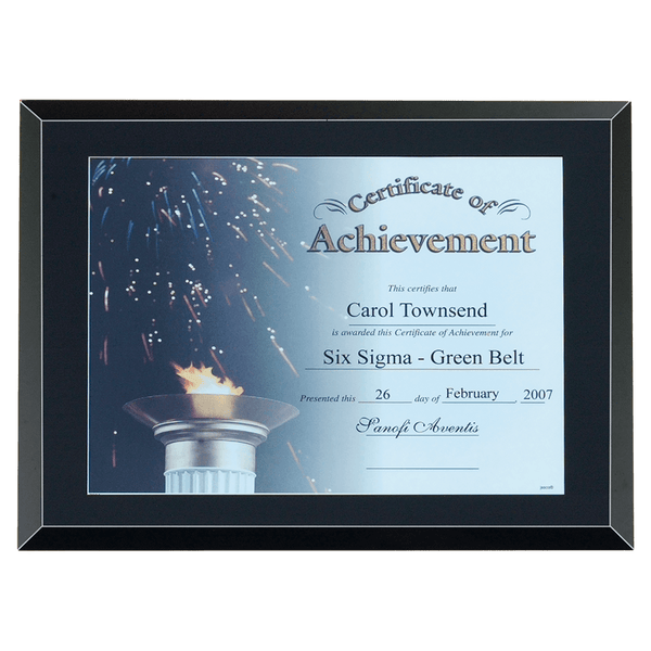 Heavy black glass certificate holder with easy-open back. Two wall hanger provide either portrait or landscape positioning on a wall. Fold-out easel stand provides either portrait or landscape positioning on any flat surface. Individually gift boxed for a perfect presentation.
