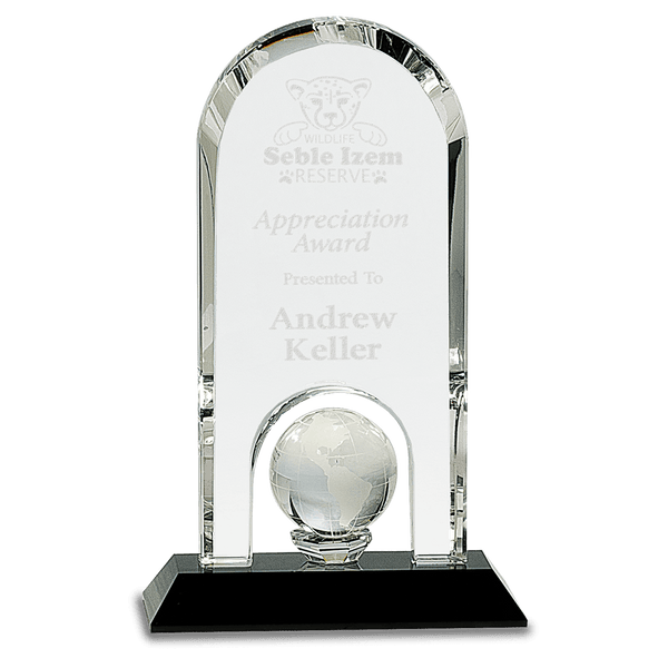 Our Premier Globe Crystal is handmade and may vary slightly in size. Clear optic crystal dome with inset globe attached to black pedestal base. Packaged individually in a lined gift box. Your recognition or gratitude will be crystal clear with crystal awards!
